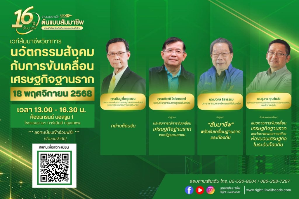 มูลนิธิสัมมาชีพเดินหน้าหนุนสร้าง “เศรษฐกิจใหม่จากฐานราก” จัดเวทีวิชาการ “นวัตกรรมสังคมกับการขับเคลื่อนเศรษฐกิจฐานราก” 18 พ.ย. นี้ เปิดผลวิจัยกรณีตัวอย่างไทย–ต่างประเทศที่ประสบความสำเร็จ พร้อมต่อยอดเป็นข้อเสนอเชิงนโยบายระดับชาติ เพื่อสร้างเศรษฐกิจฐานรากเติบโตยั่งยืน