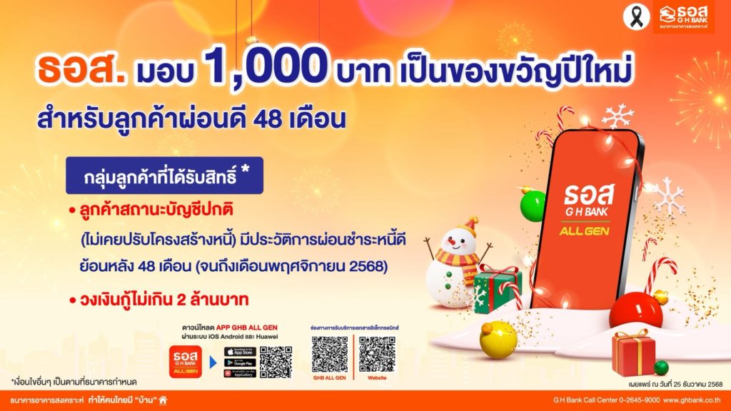 ทั้งนี้ ลูกค้าจะต้องกดรับบริการเอกสารอิเล็กทรอนิกส์ (Consent) ผ่านทาง Application : GHB ALL GEN หรือทาง http://www.ghbank.co.th จำนวน 6 รายการ ประกอบด้วย (1) ใบเสร็จชำระหนี้เงินกู้ (2) หนังสือแจ้งเปลี่ยนแปลงเงินงวดใหม่ที่ต้องผ่อนชำระ (3) หนังสือแจ้งผลการขอลดอัตราดอกเบี้ยเงินกู้ (4) หนังสือปรับอัตราดอกเบี้ยและเงินงวดเพิ่ม (5) หนังสือข้อมูลเครดิต และ (6) หนังสือรับรองดอกเบี้ยเงินกู้ และดาวน์โหลด Application : GHB ALL GEN พร้อมผูกบัญชีเงินฝากออมทรัพย์ ธอส. ภายในวันที่ 31 มกราคม 2569 พร้อมชำระเงินงวดผ่าน Application :GHB ALL GEN ไม่น้อยกว่าเงินงวดที่ธนาคารกำหนดติดต่อกัน 2 เดือน (ในงวดเดือนธันวาคม 2568 และเดือนมกราคม 2569) กรณีลูกค้าสวัสดิการหักเงินเดือนให้หักเงินเดือนเพื่อชำระผ่านหน่วยงานตามปกติเพื่อรับโอนเงินของขวัญปีใหม่จากธนาคารตั้งแต่เดือนมกราคม – เดือนกุมภาพันธ์ 2569 สอบถามรายละเอียดเพิ่มเติมได้ที่ G H Bank Call Center โทร 0-2645-9000 หรือ Facebook Fanpage ธนาคารอาคารสงเคราะห์ ติดตามข่าวสารของธนาคาร ได้ที่ G H Bank Social Media