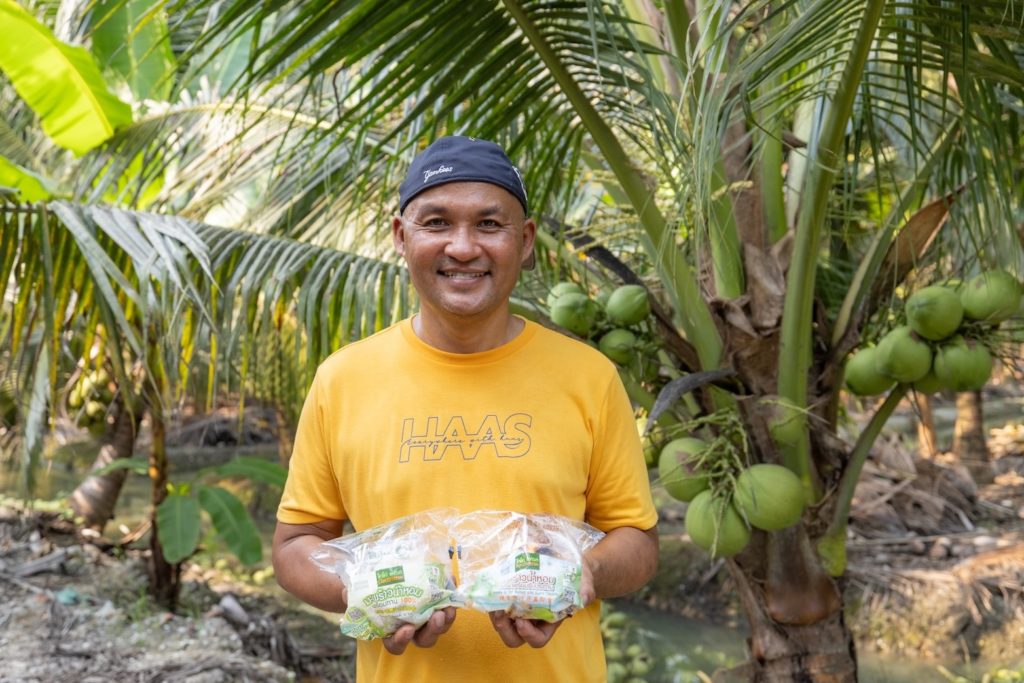 เบื้องหลังมะพร้าวพร้อมทาน โคโค่ เฟรส ทุกลูก มาจากเครือข่ายเกษตรกร น้องแตงโม เกษตรกรและเจ้าของล้งมะพร้าวรุ่นใหม่ วัย 31 ปี จากจังหวัดราชบุรี ทำหน้าที่รวบรวม คัดเลือก และแปรรูปมะพร้าวจากสวนในชุมชน ไม่ได้เป็นเพียงชาวสวนทั่วไป แต่เป็นผู้สร้าง ล้งมะพร้าวในชุมชน ที่ดูแลกระบวนการตั้งแต่การรับซื้อมะพร้าวจากเกษตรกรรายย่อย ไปจนถึงการแปรรูปขั้นต้นก่อนเข้าสู่โรงแพ็ก