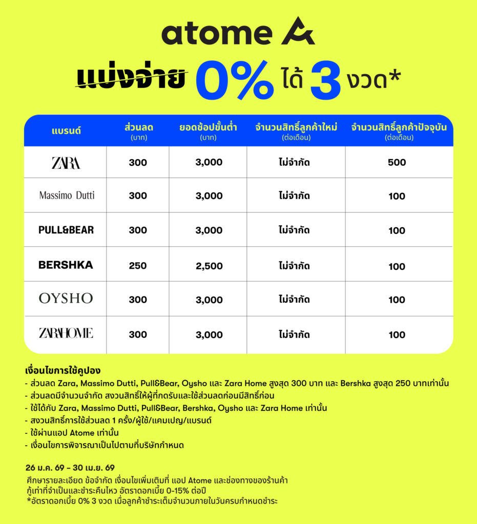 นอกจากนี้ Atome ได้มอบส่วนลดพิเศษ เมื่อลูกค้าใช้บริการชำระเงินผ่าน Atome โดยรับส่วนลดจาก Zara, Massimo Dutti, Pull&Bear, Oysho และ Zara Home สูงสุด 300 บาท และ Bershka สูงสุด 250 บาท มีจำนวนจำกัด สงวนสิทธิ์ให้ผู้ที่กดรับและใช้ส่วนลดก่อนมีสิทธิ์ก่อน โดยสามารถใช้ส่วนลดได้ 1 ครั้ง/ผู้ใช้/แคมเปญ/แบรนด์ และรับสิทธิ์ผ่านแอปพลิเคชัน Atome เท่านั้น ตั้งแต่วันที่ 26 มกราคม 2569 – 30 เมษายน 2569