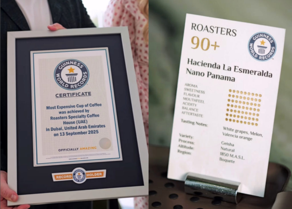 เพื่อสร้างสถิติโลกให้เป็นที่ประจักษ์สำหรับลงใน “กินเนสบุ๊ค” ร้านกาแฟหรูดูไบแห่งนี้ ขายกาแฟปานา เกอิชา แบบดริป ในราคาแก้วละ 2,500 เดอร์แฮม คิดเงินไทยก็ตกราว 22,000 บาท