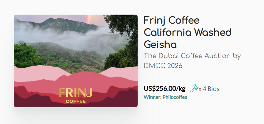 กาแฟเกอิชา แบบวอช โพรเซส จำนวน 20 กิโลกรัม ปลูกโดย “คอนดอร์ ริดจ์ แรนช์” (Condor Ridge Ranch) ไร่กาแฟบริเวณเชิงเขาซานตาบาร์บารา ซึ่งเป็นของบริษัทกาแฟฟรินจ์ คอฟฟี่ (Frinj Coffee) ในแคลิฟอร์เนีย กลายเป็นกาแฟล็อตแรกจากแผ่นดินใหญ่ของสหรัฐอเมริกาที่ถูกขายในการประมูลระดับนานาชาติ ได้ราคาประมูลสูงสุดที่ 256 ดอลลาร์สหรัฐต่อกิโลกรัม มีร้านกาแฟพิเศษญี่ปุ่น ฟิโลคอฟเฟีย ชนะประมูลไป